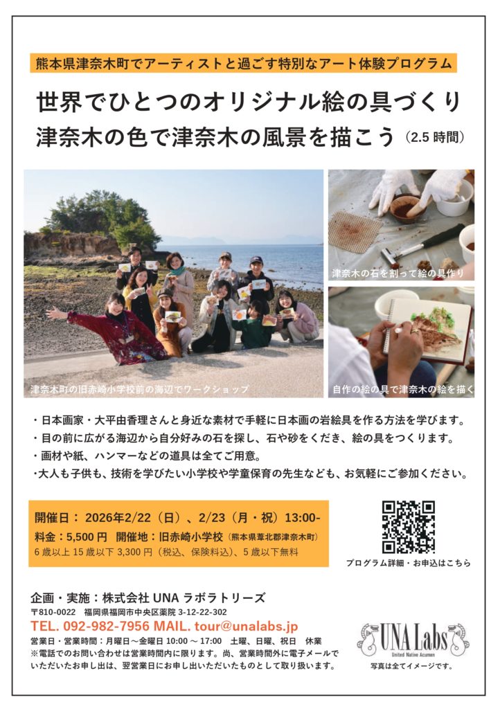 日本画家 大平由香理さんと世界で一つだけのオリジナル絵具づくり風景スケッチ体験をしてみませんか。旧赤崎小学校先の海辺にある石や砂を使って、オリジナルの絵具づくりが体験できます。ぜひ、ご参加ください。詳しくは以下の企画会社HPをご覧ください。