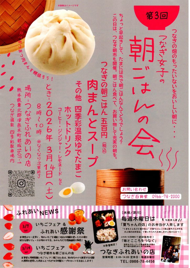 同日にはつなぎ朝市も開催します。朝ごはんを食べて、お買い物して充実の朝を。