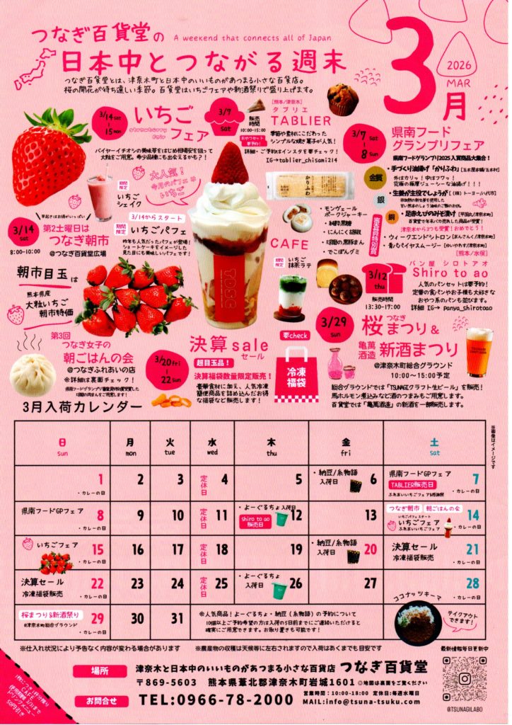 その他、県南フードグランプリで受賞した商品(津奈木からは3品受賞!)が購入できる県南フードグランプリフェア、決算福袋販売など今月も盛りだくさんで皆様をお待ちしております。